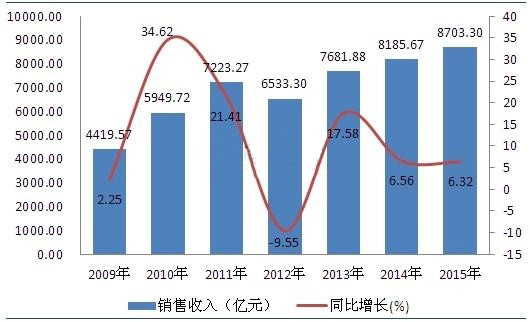 近年來,我國儀器儀表行業市場規模實現了快速擴張。據《中國專用儀器儀表行業劃分析報告》數據顯示,2011年達到7223.27億元,同比增幅達到21.41%。2012年,我國儀器儀表行業市場規模同比有所縮減,降至6533.30億元,同比下降9.55%。2013年以來,我國儀器儀表行業產品銷售明顯回暖,到2015年,我國儀器儀表行業銷售收入為8703.3億元,同比增長6.32%
