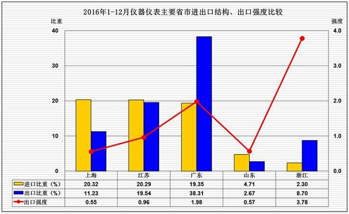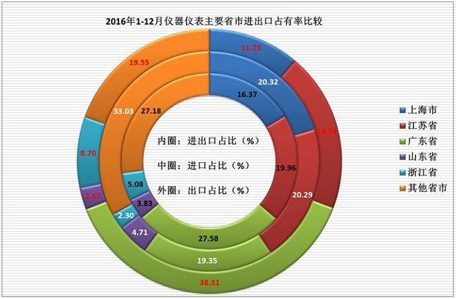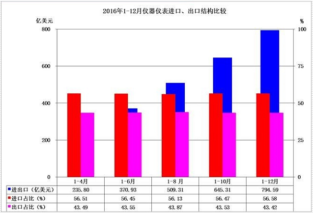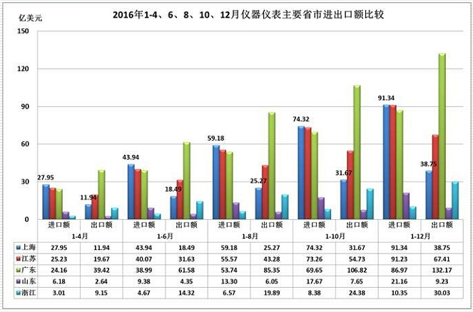 而從進出口情況來看,2016年1-12月,全國31個省市儀器儀表行業累計進出口總額為7945928萬美元,同比下跌1.91%;累計進口總額4495608萬美元,同比下跌1.13%;累計出口總額為3450320萬美元,同比下跌2.92%;進出口累計貿易逆差1045288萬美元,同比上升5.25%。具體各省市的進出口情況詳情如下。