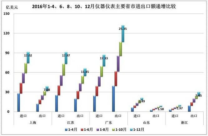 2016年1-12月,全國31個省市儀器儀表行業累計進出口總額為7945928萬美元,比上年同期減少155131萬美元,下跌1.91%;其中上海、河南等13個省市同比合計增加了139332萬美元。其余18個省市合計減少294463萬美元,廣東減少多(204457萬美元);上海、河南、福建、山東和浙江等5個省市的增加額均超過15000萬美元,上海增加多(37708萬美元)。
